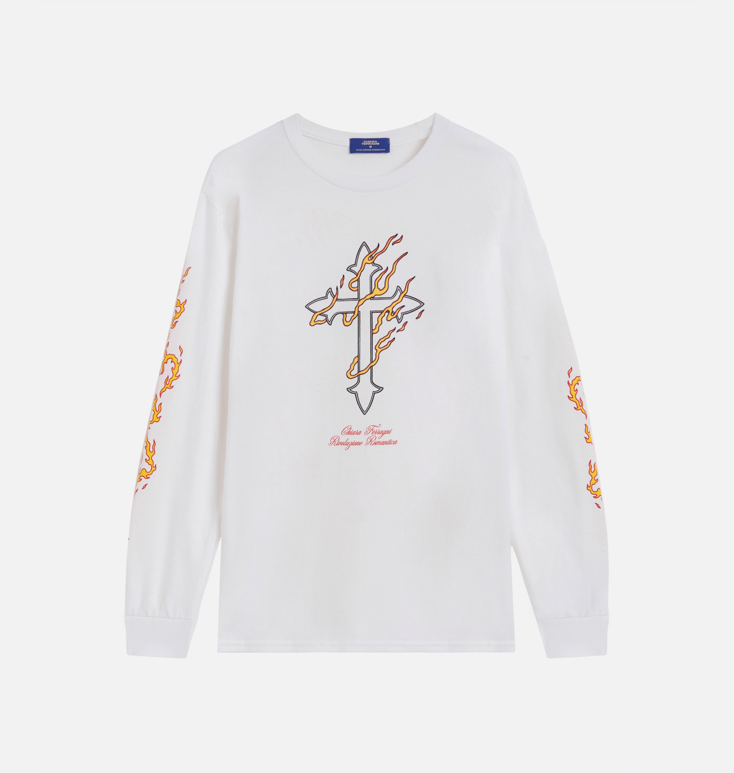 A piece for those who want to combine simplicity with meaning. Made from soft cotton, this long-sleeve t-shirt blends comfort with character. The phrase "Amami fino alla fine del mondo" is for those who take love (or style) seriously but with a light touch. This is a limited-edition item created in collaboration with Rivoluzione Romantica a creative encounter that blends aesthetics and attitude. Size S/M has a regular fit, while size L/XL has an oversized fit. Chiara Ferragni, 178 cm tall, is wearing size S/M.