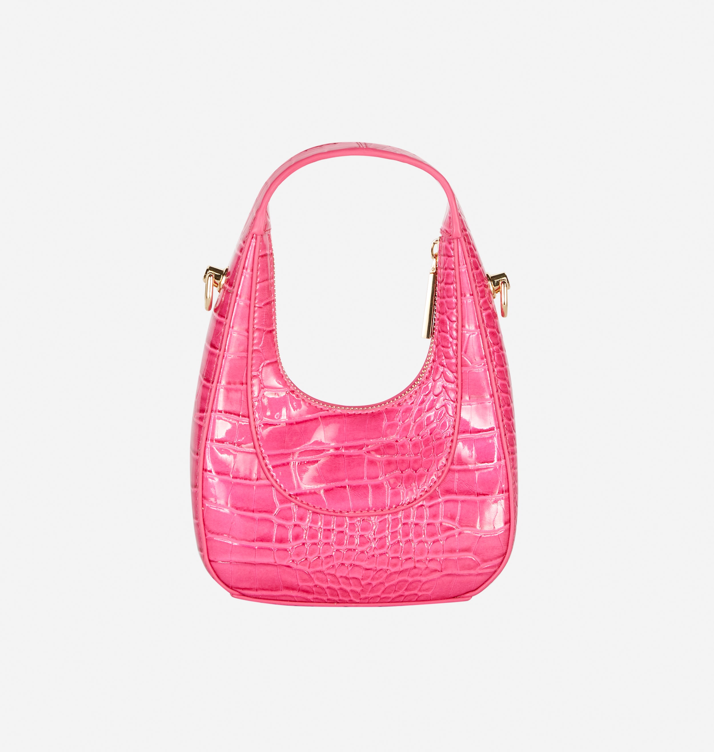 Fuchsia "Caia" micro bag in croc-print synthetic material, hand-held hobo model, zip closure. Chiara Ferragni logo on the front and Eye Star metal feet on the bottom. Inside, one zipped pocket. Equipped with a removable shoulder strap. L: 16 cm, H: 24 cm, D: 6 cm