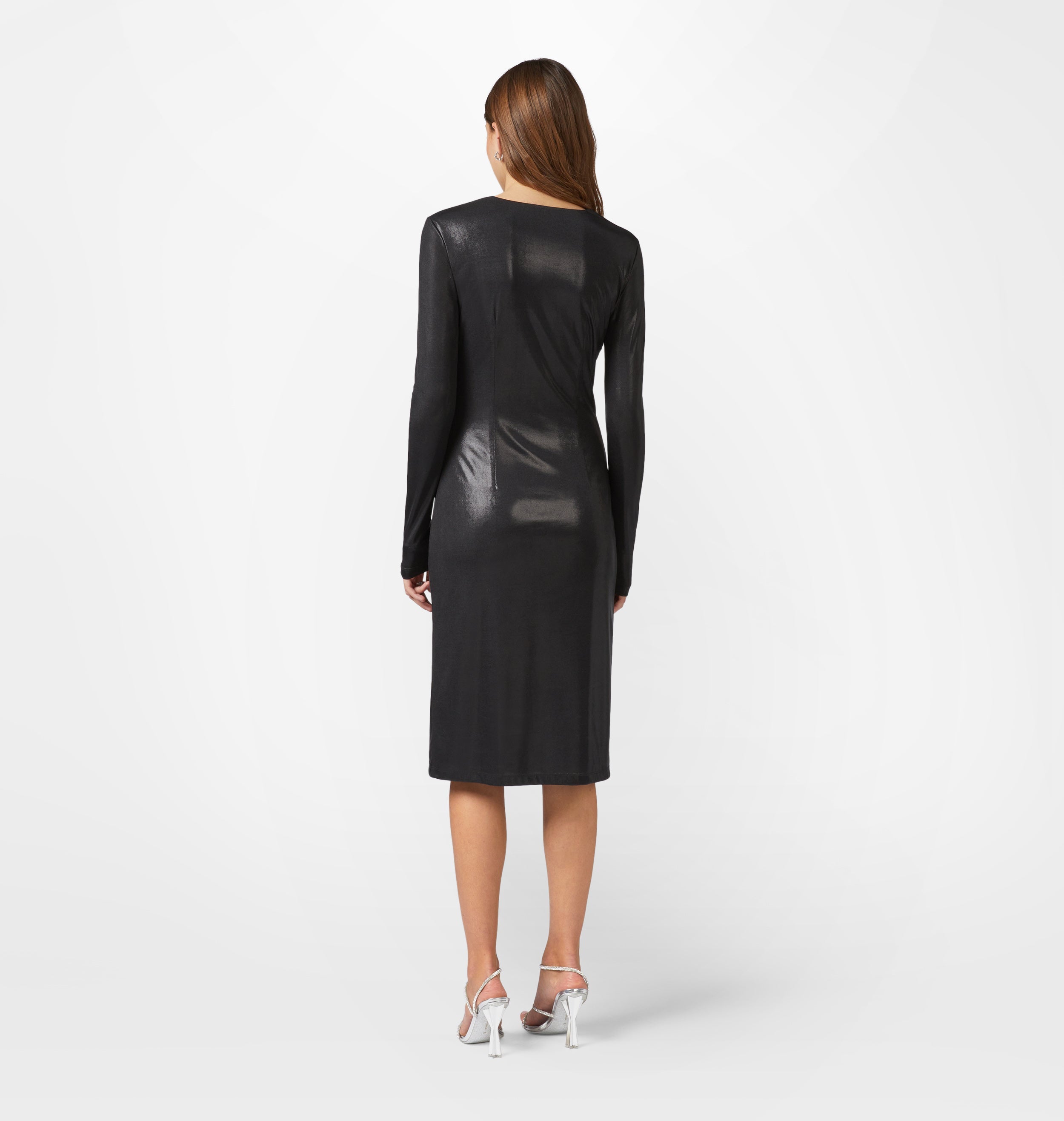 Black jersey dress with laminated effect, below-the-knee length and deep front neckline with rhinestone accessory.