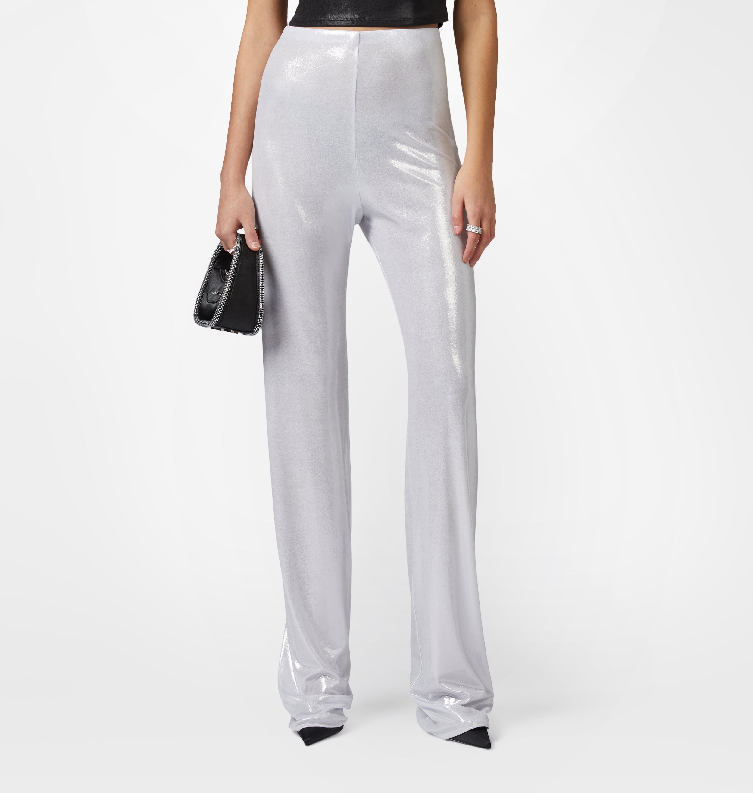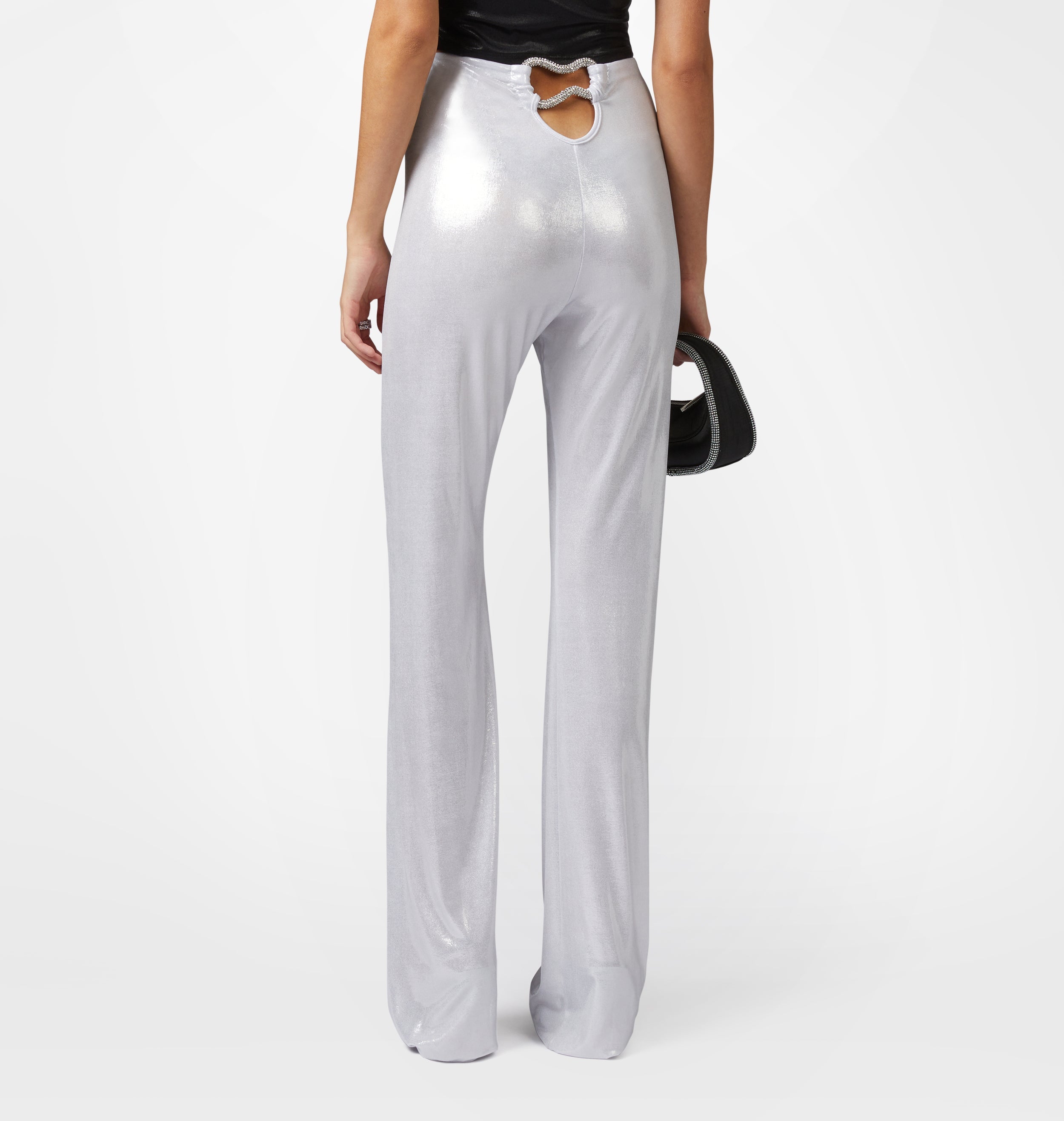 Silver fabric trousers with laminated effect with soft leg and rhinestone accessory on the back.