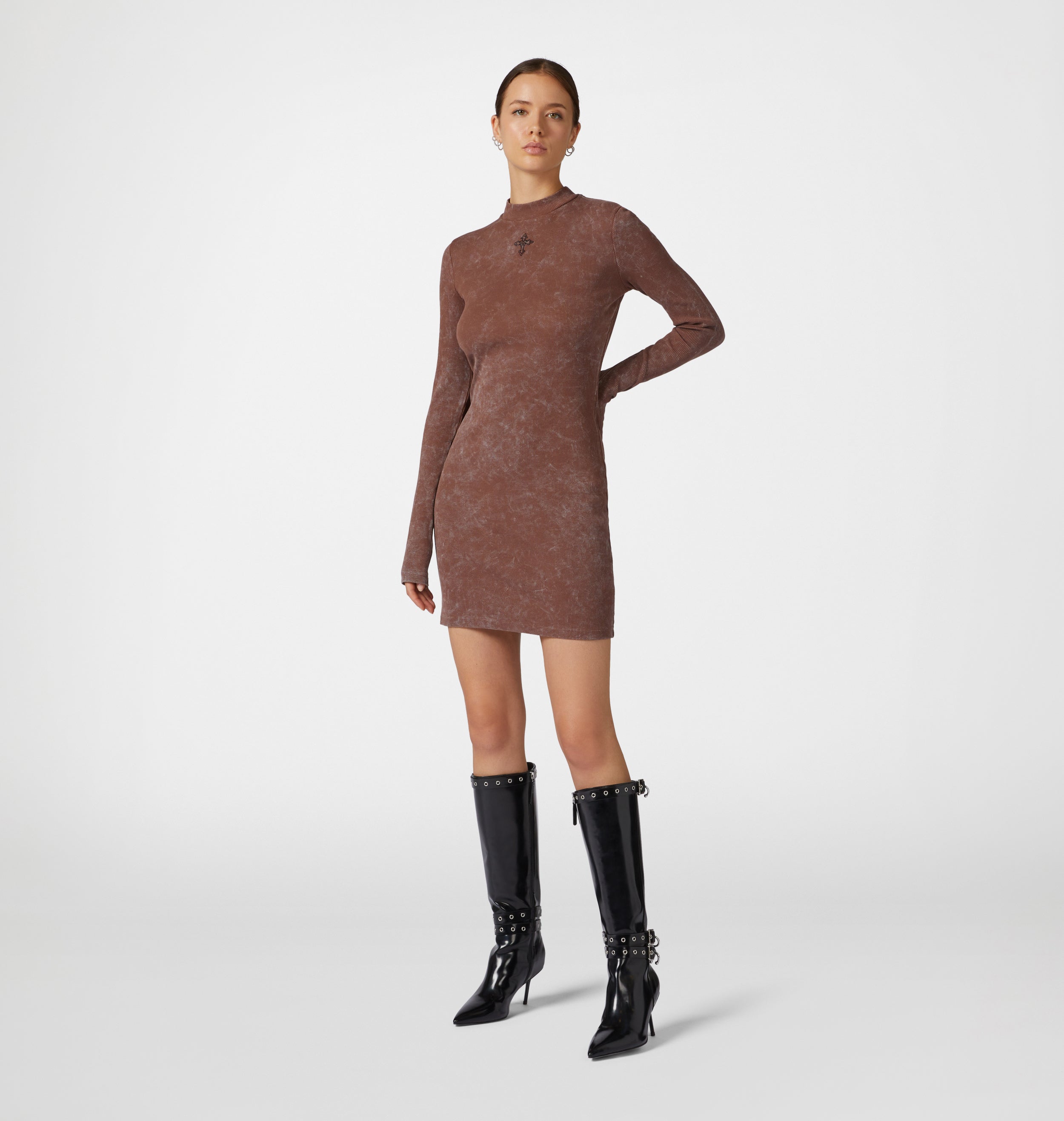 Brown long-sleeved ribbed dress with marbled effect and embroidered cross. Slim fit.