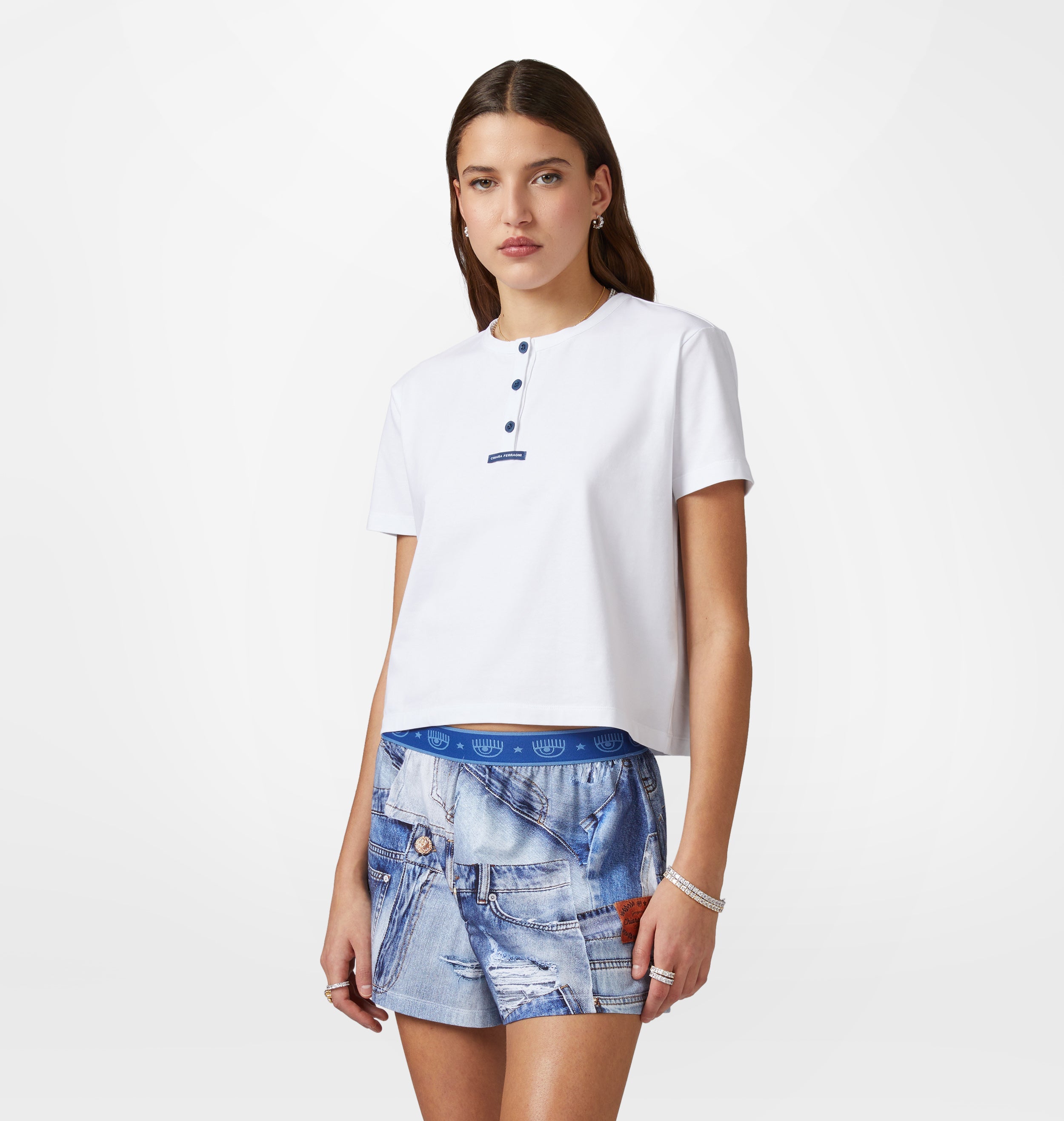 Short cotton pyjamas with white T-shirt and shorts in all-over denim print.