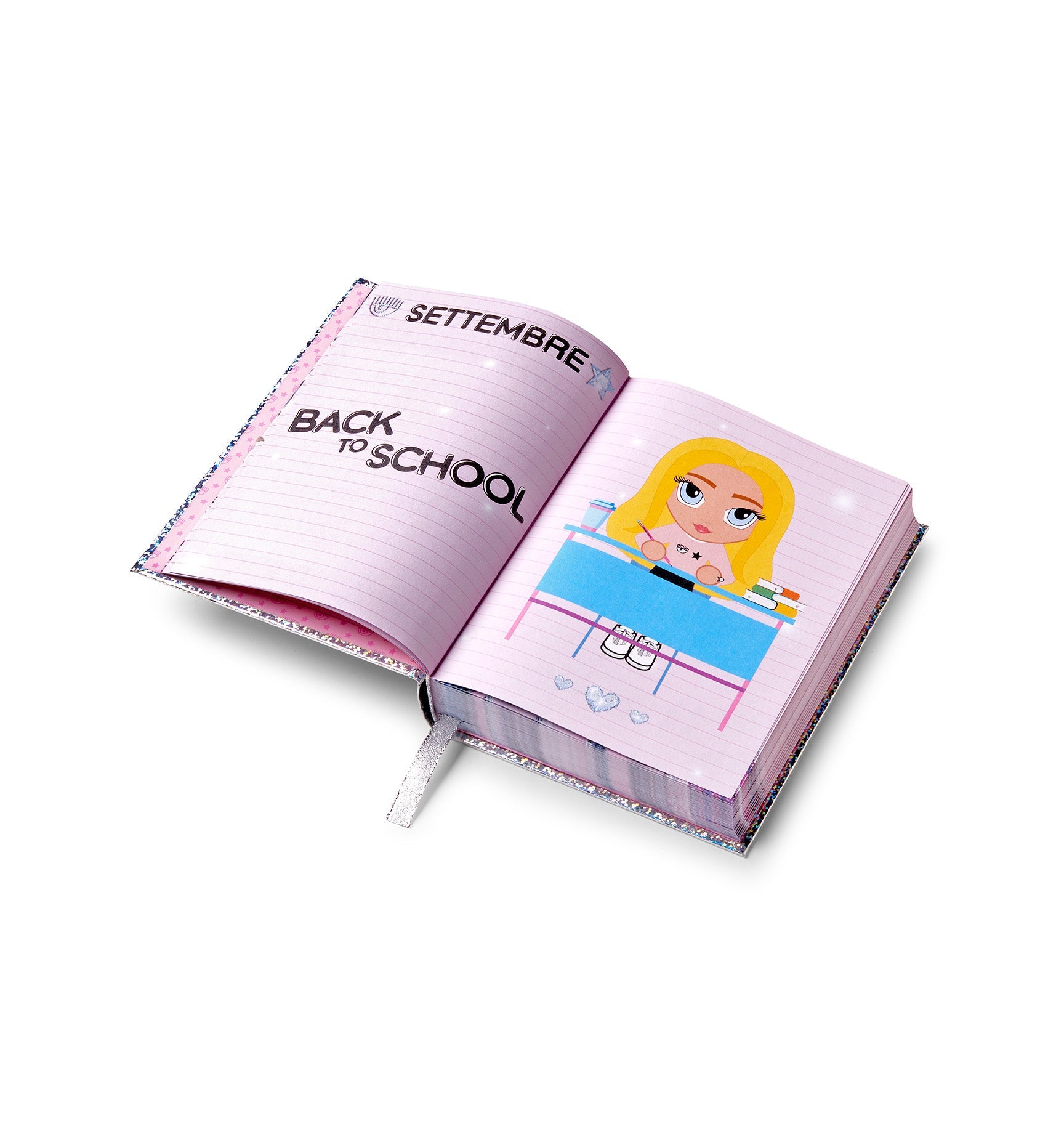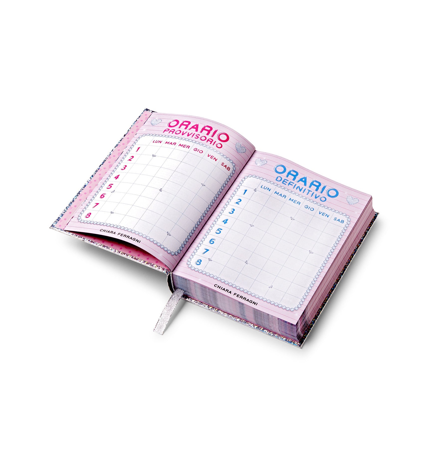 Diary/Agenda 16 months format 13 x 18 cm with slipcase, featuring a silver cover covered with rhinestones and logo on metal plate. Silver ribbon page marker.