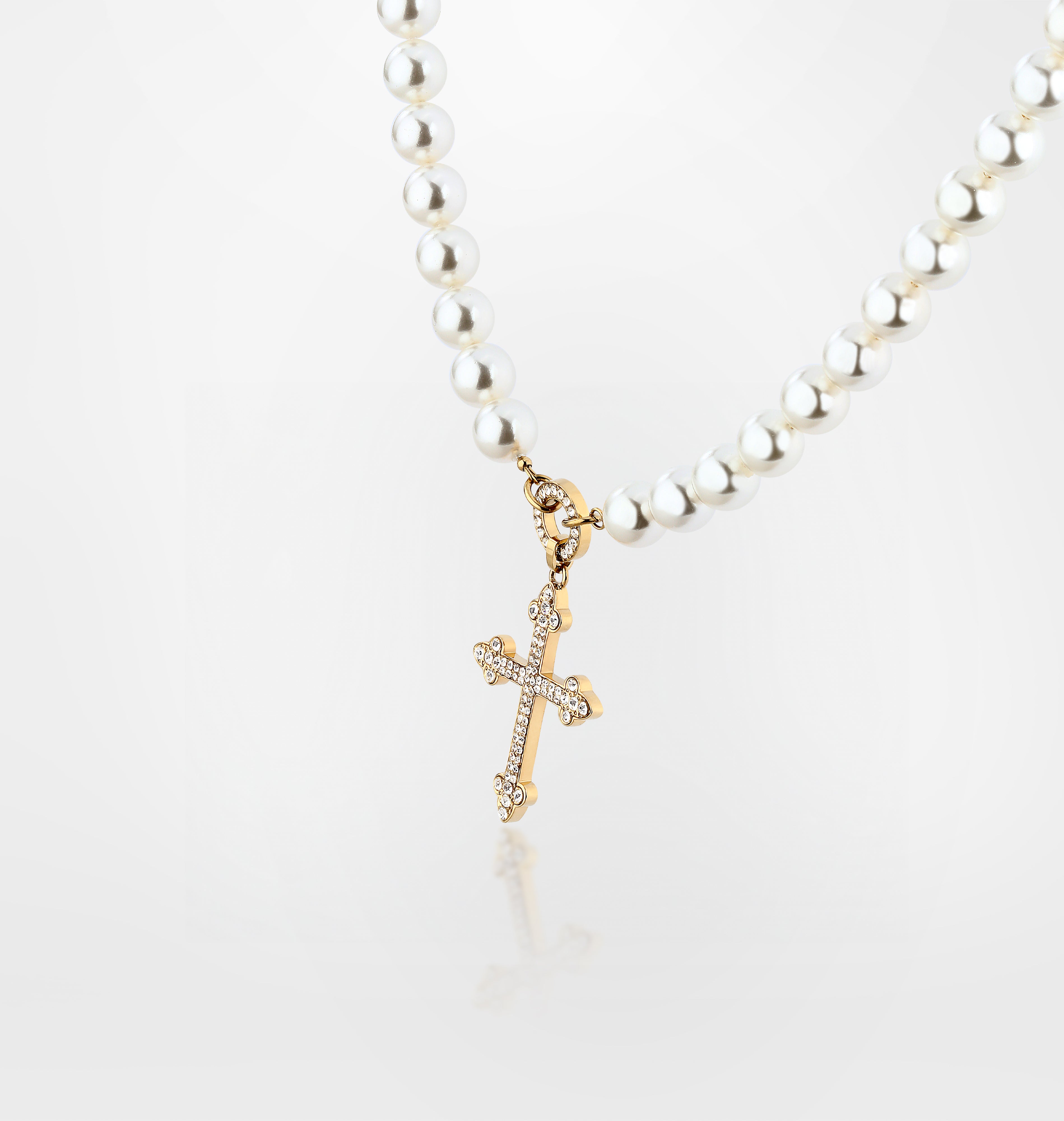 An accessory for those who love to shine… with a touch of character. This choker combines the classic charm of synthetic pearls with a gothic-style cross in 18k gold plating, enhanced by a pavé of transparent stones that catch every reflection. The adjustable chain lets you choose whether to wear it shorter or longer, depending on the mood of the moment. A detail that blends aesthetics and attitude, designed to light up any look.