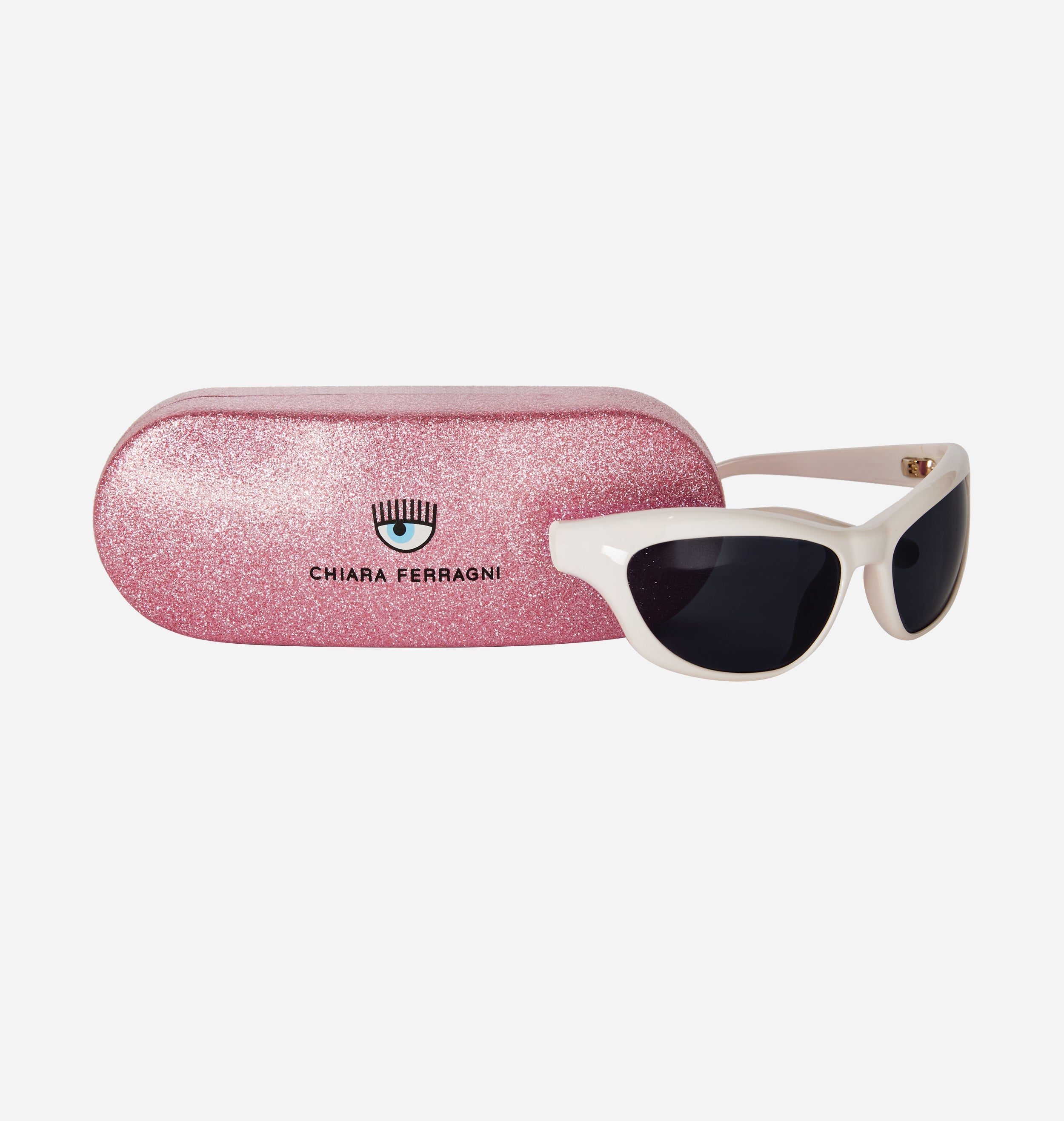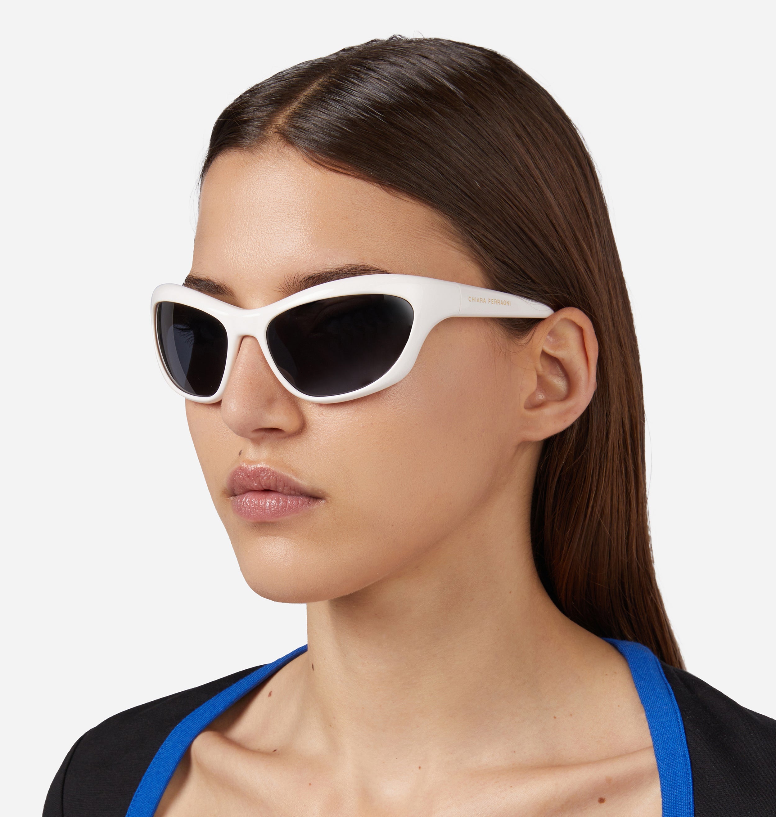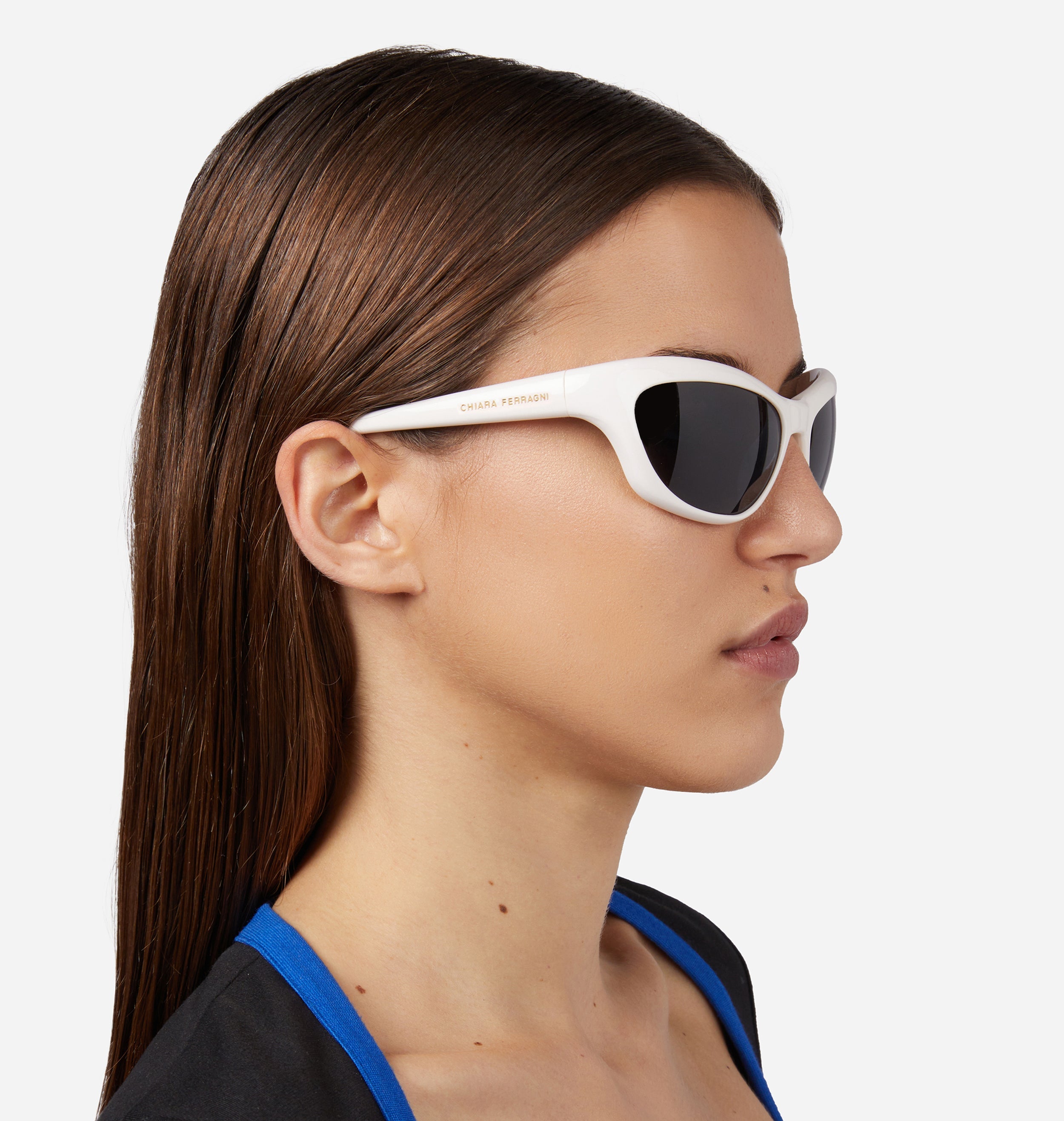 White Sky Eye sunglasses with Chiara Ferragni logo. Dark gray lenses in polycarbonate. Lens protection index: cat. 3 Lens width: 60 mm Lens height: 39 mm Nose width: 17 mm Temple length: 144,5 mm