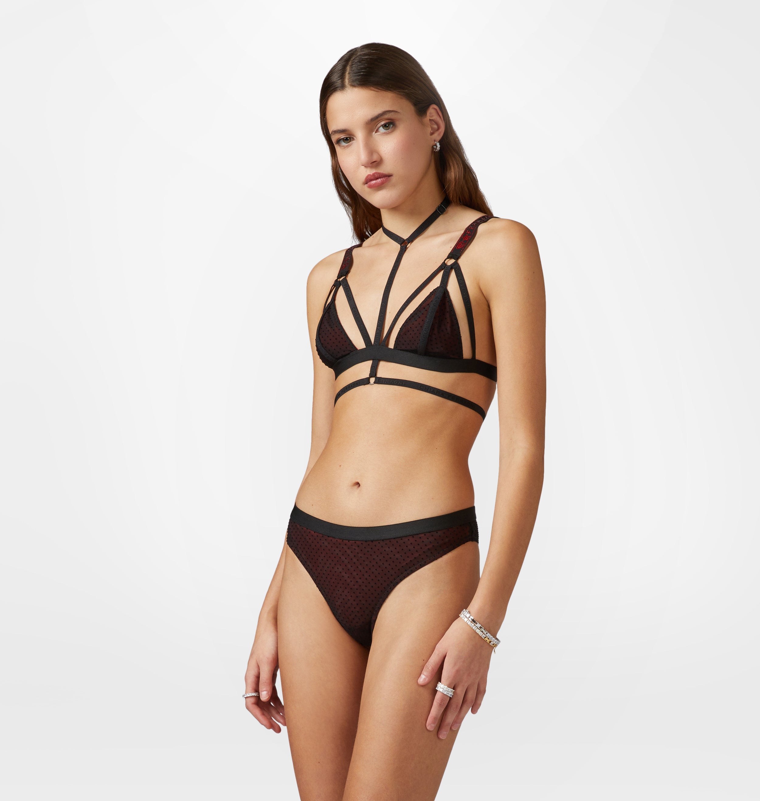 Triangle bra in black and red polka dot tulle, black straps with rhinestone logo and cross detail on the neck and under the bust.