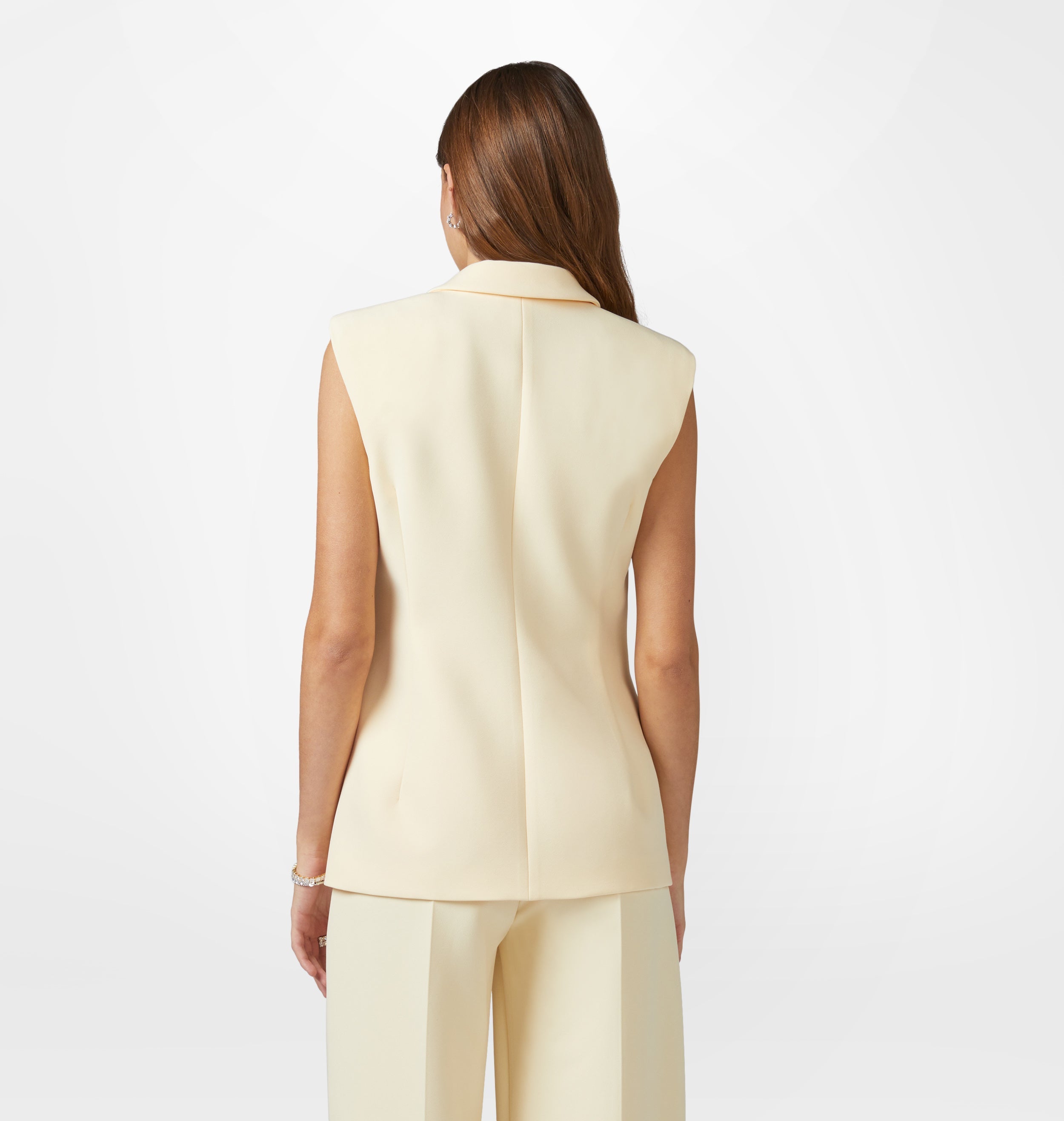 Apricot yellow stretch cady sleeveless jacket, hidden one-button opening. Slim fit.